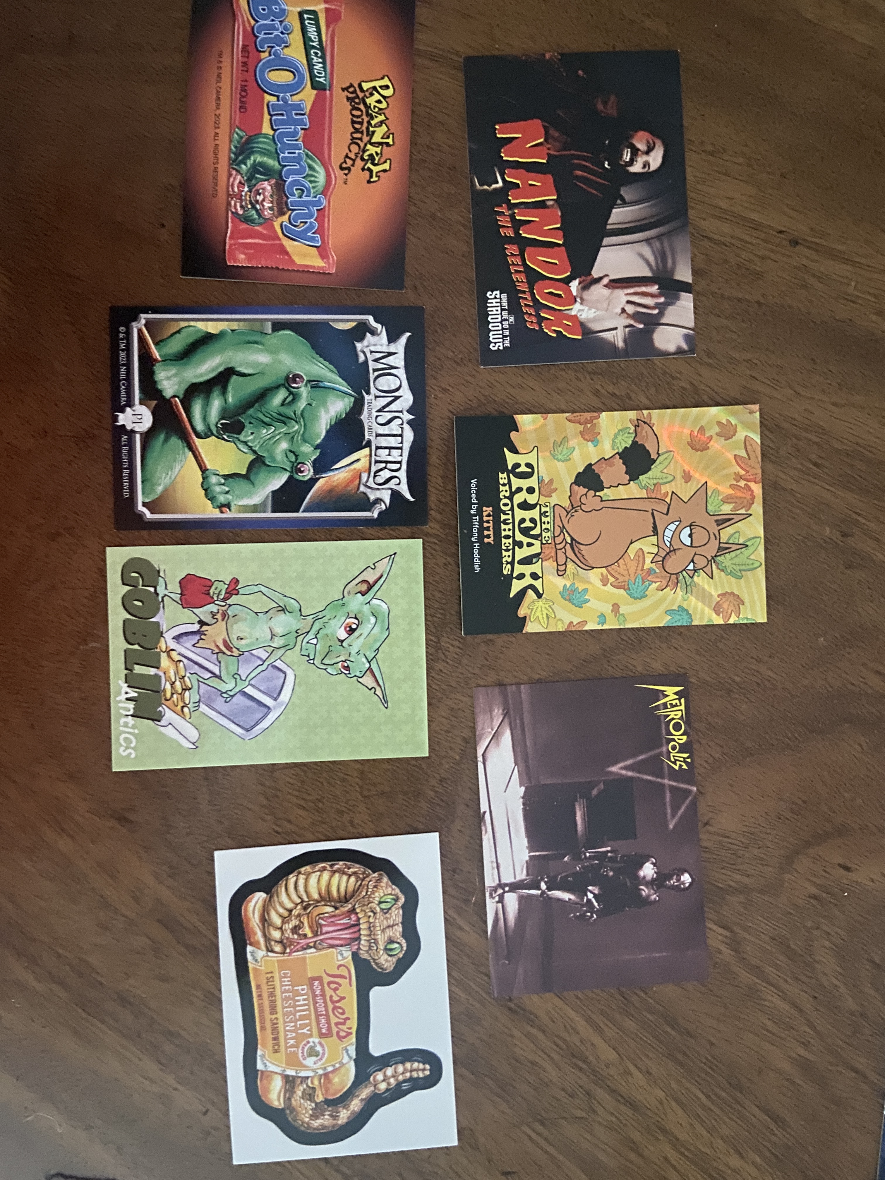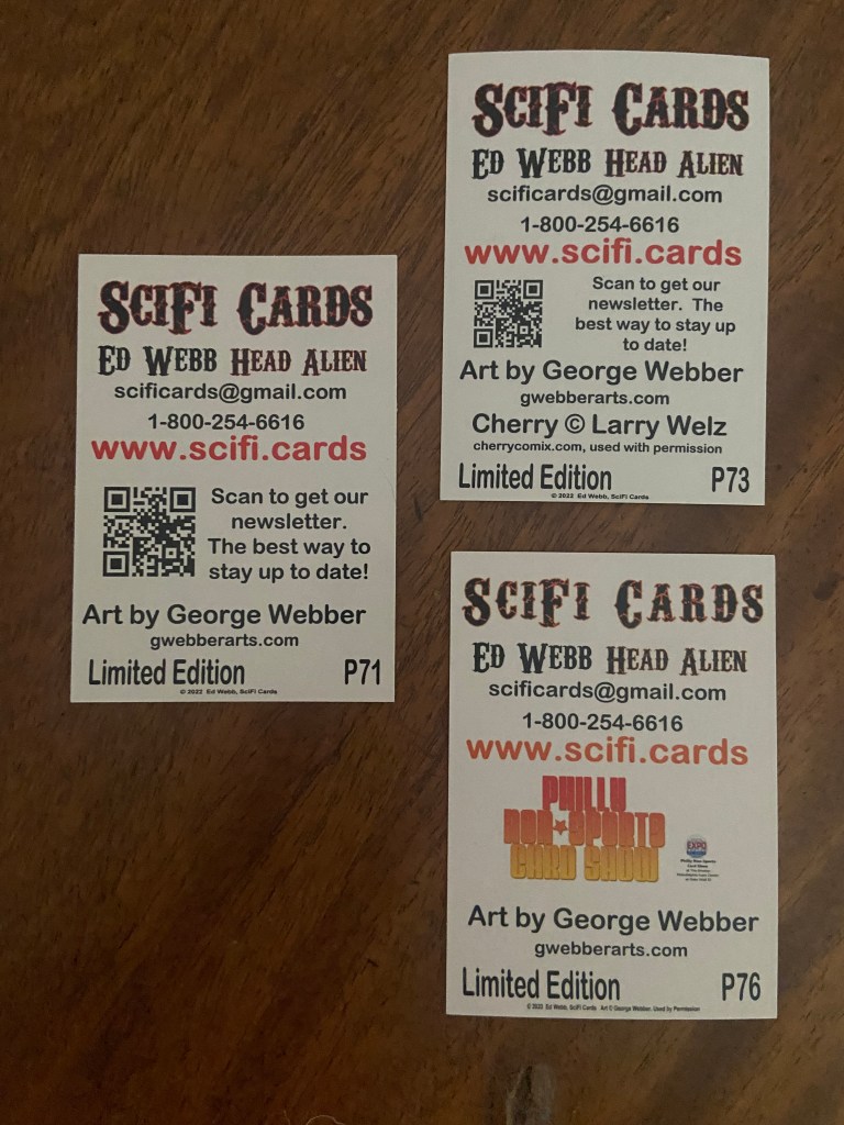 Last week I attended the Philly Non-Sports Show which is held twice a year (spring, fall). Trying to same some money, so was mostly just looking around to see what was available. Like always, I was able to pick up a bunch of free / cheep promo cards. You get a pack of promos with your admission, plus companies like Rittenhouse Archives and Cryptozoic will had out promos for upcoming sets. Some dealers / artists will also give away promo cards. Would like to personally thank Ed Webb, George Wright, and the others who were generous enough to offer free promos (and even take the time to sign them) Here are some pictures promos and cards I picked up as I walked around.