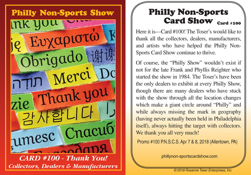 Only ays until the 84th Philly Non-Sports Card Show, held at The Greater Philadelphia Expo Center in Oaks, PA – Hall D. I have been attending the show for well over 20 years and always look forward to seeing friends and fellow card collectors. Here are some of the Free Philly Show Promos that are given out at each show. I have most of them, and a lot I got signed while at the shows. A big thanks to the Toser Family (Roxanne, Marlon, and Harris) for helping me out in finding some of the older promos, as well as hooking me up with blanks to get signed