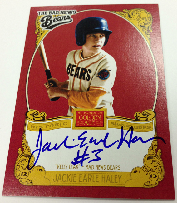 In 2013, Panini America released the first “Bad News Bears” trading cards, including autographs inside the 2013 Golden Age Baseball release. I have collected almost every card in the set, except for the Jackie Earl Haley (Kelly Leak) Auto Card and a few of the rarer 1 / 1 cards.